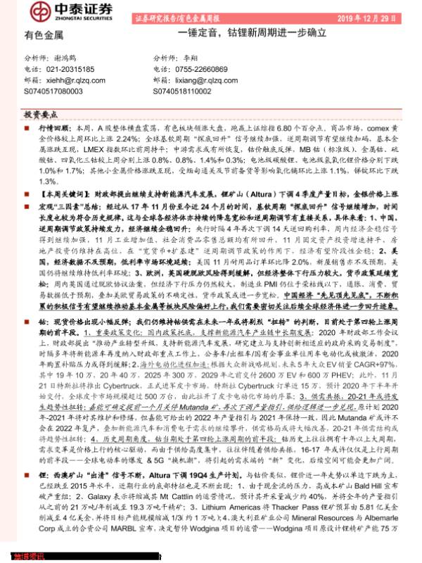 【中泰证券】【20191229】20191229-中泰证券-有色金属周报:一锤定音,钴锂新周期进一步确立-32页 行业研究
