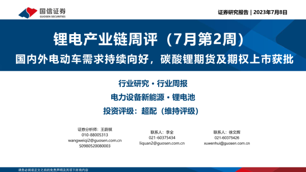 【国信证券】【20230708】锂电产业链周评(7月第2周):国内外电动车需求持续向好,碳酸锂期货及期权上市获批-17页 行业研究