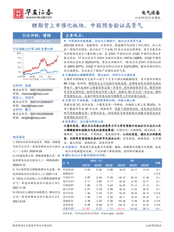 【华安证券】【20210704】电气设备行业周报:锂期货上市催化板块,中报预告验证高景气-23页 行业研究