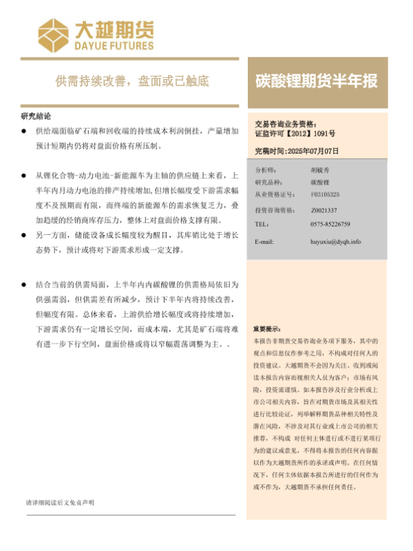 【大越期货】【20250707】碳酸锂期货半年报_供需持续改善_盘面或已触底-17页 证券期货研究报告