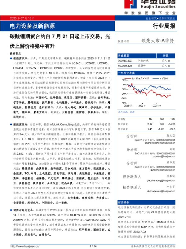 【华金证券】【20230716】电力设备及新能源行业周报:碳酸锂期货合约自7月21日起上市交易,光伏上游价格稳中有升-14页 行业研究