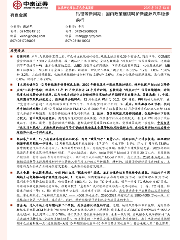 【中泰证券】【20200113】钴锂等新周期:国内政策继续呵护新能源汽车稳步前行-33页 行业研究