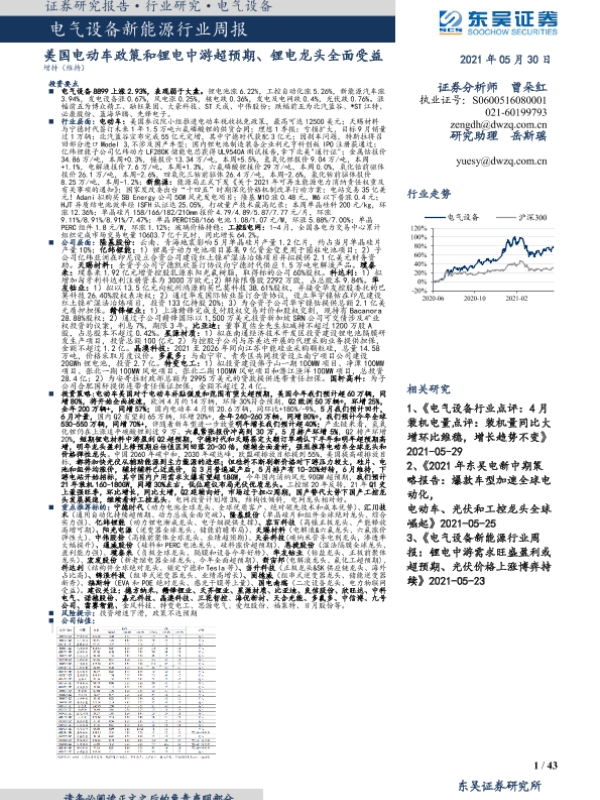 【东吴证券】【20210530】电气设备新能源行业周报:美国电动车政策和锂电中游超预期、锂电龙头全面受益-43页 行业研究