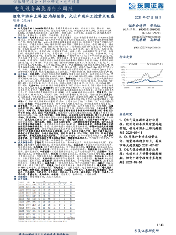 【东吴证券】【20210718】电气设备新能源行业周报:锂电中游和上游Q2均超预期,光伏户用和工控需求旺盛-43页 行业研究