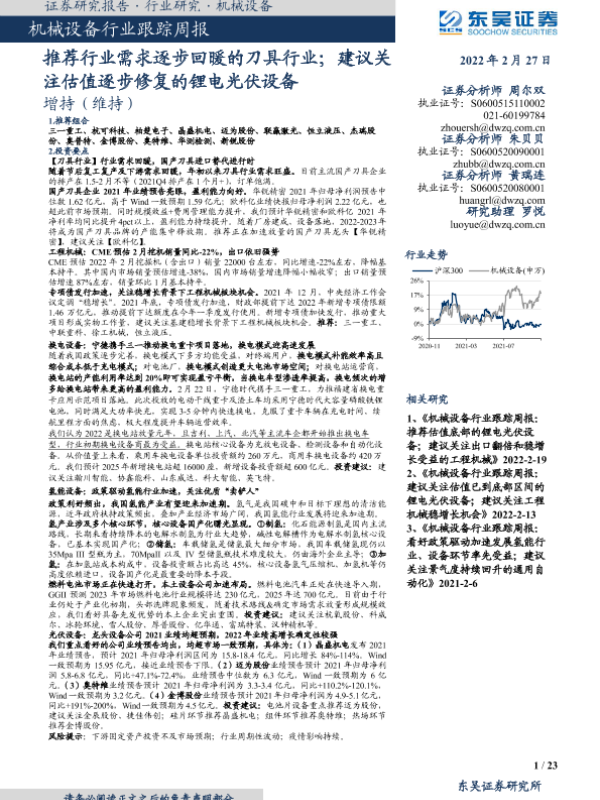 【东吴证券】【20220227】20220227-东吴证券-机械设备行业跟踪周报:推荐行业需求逐步回暖的刀具行业;建议关注估值逐步修复的锂电光伏设备-23页 行业研究