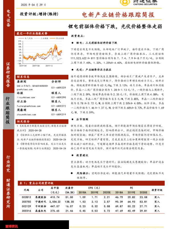 【财通证券】【20200429】电新产业链价格跟踪简报:锂电前驱体价格下跌,光伏价格整体走弱-11页 行业研究