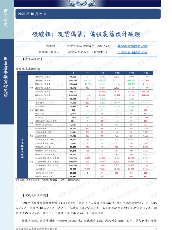 【国泰君安期货】【202510】碳酸锂:现货偏紧,偏强震荡预计延续-3页 证券期货研究报告