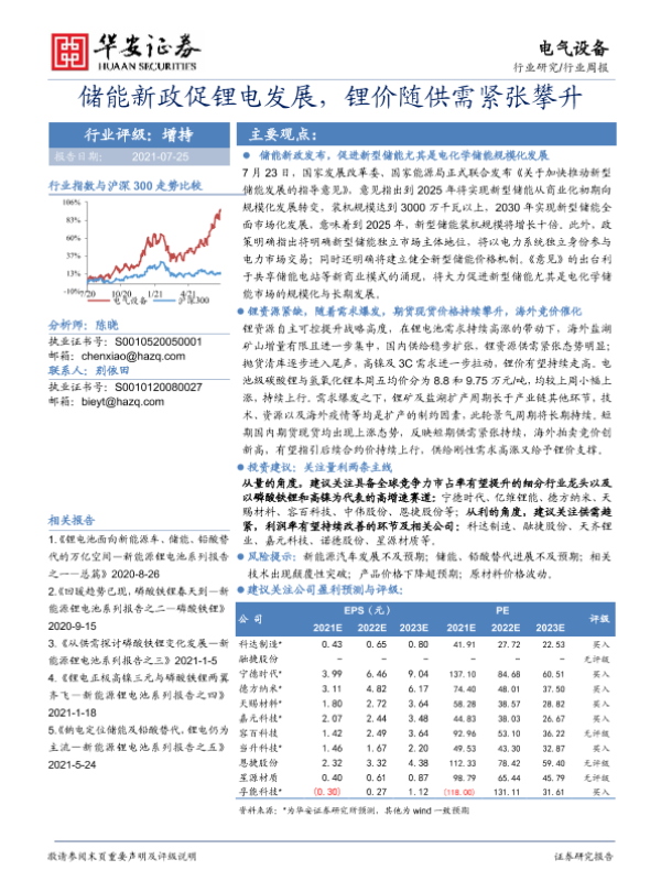【华安证券】【20210725】20210725-华安证券-电气设备行业周报:储能新政促锂电发展,锂价随供需紧张攀升-21页 行业研究