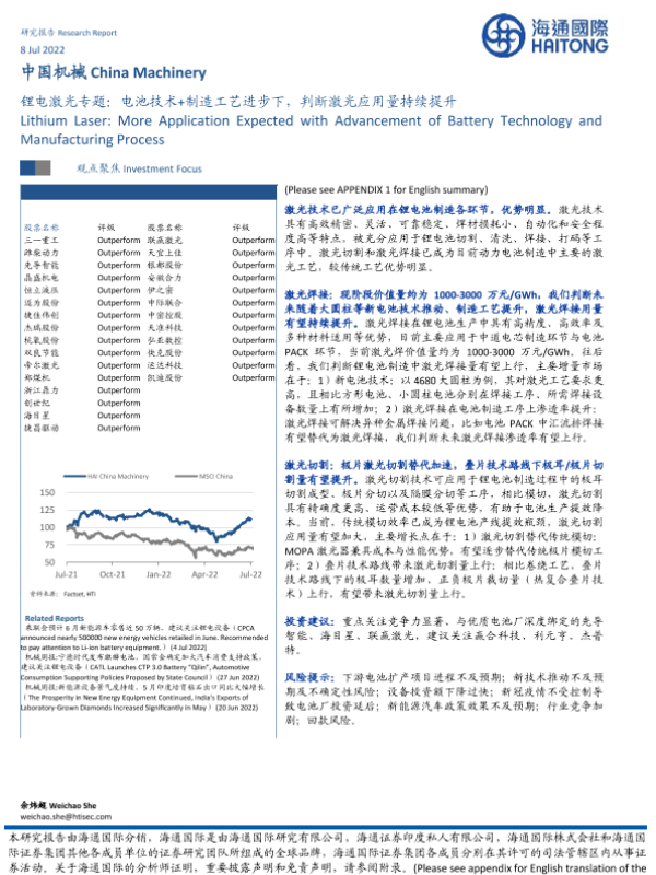 【海通国际】【20220708】中国机械行业锂电激光专题:电池技术+制造工艺进步下,判断激光应用量持续提升-30页 行业研究