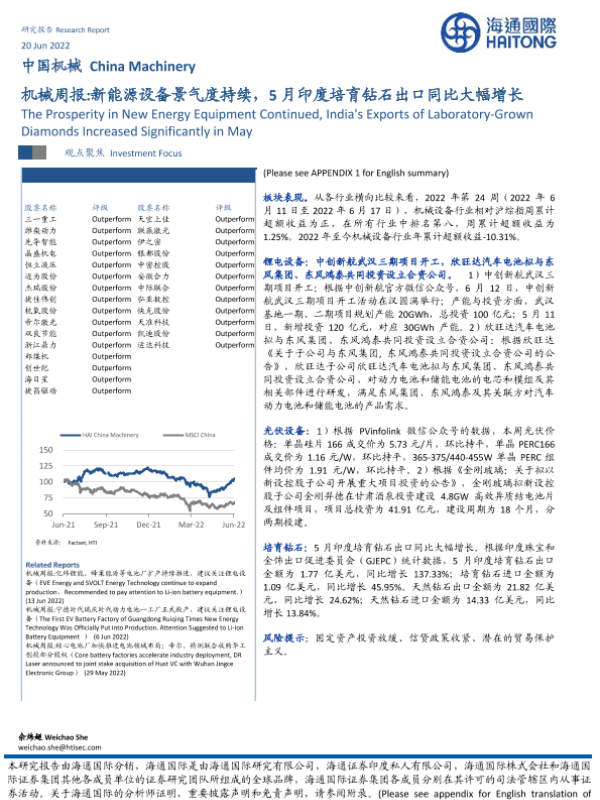 【海通国际】【20220620】机械周报 新能源设备景气度持续,5月印度培育钻石出口同比大幅增长-15页 行业研究