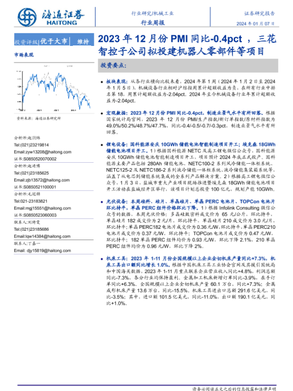 【海通证券】【20240107】20240107-海通证券-机械工业行业周报:2023年12月份PMI同比-0.4pct,三花智控子公司拟投建机器人零部件等项目-10页 行业研究