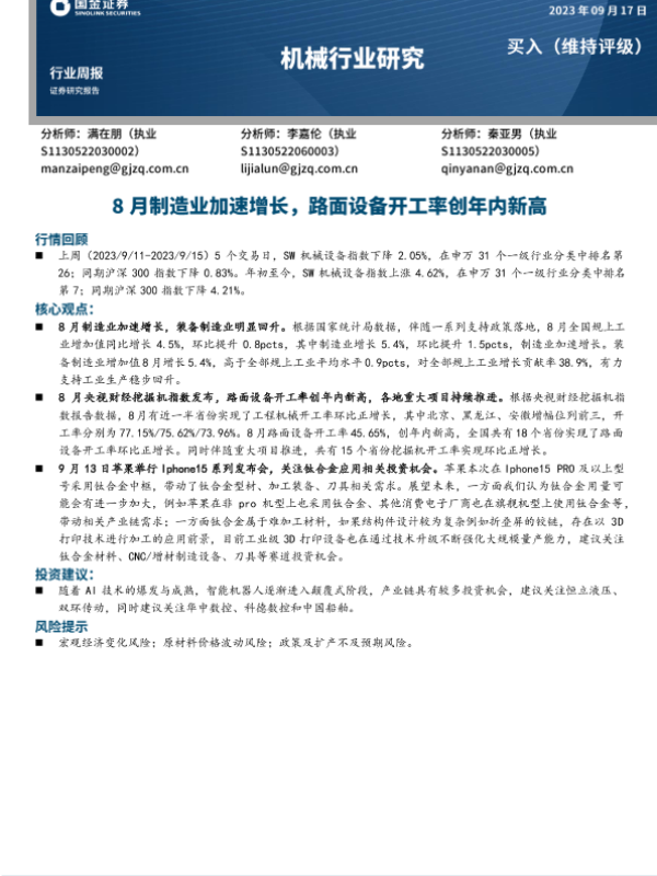 【国金证券】【20230917】20230917-国金证券-机械行业研究:8月制造业加速增长,路面设备开工率创年内新高-16页 行业研究