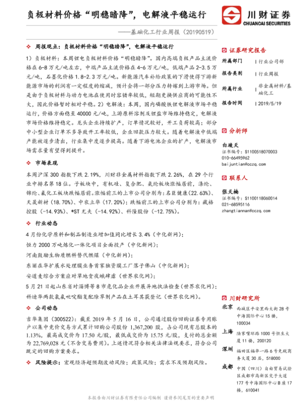 【川财证券】【20190519】20190519-川财证券-基础化工行业周报:负极材料价格“明稳暗降”,电解液平稳运行-21页 行业研究