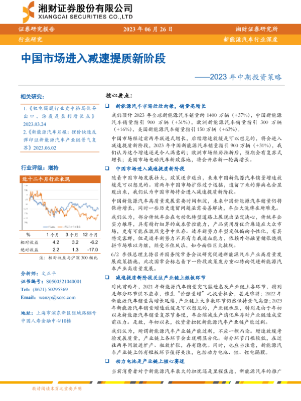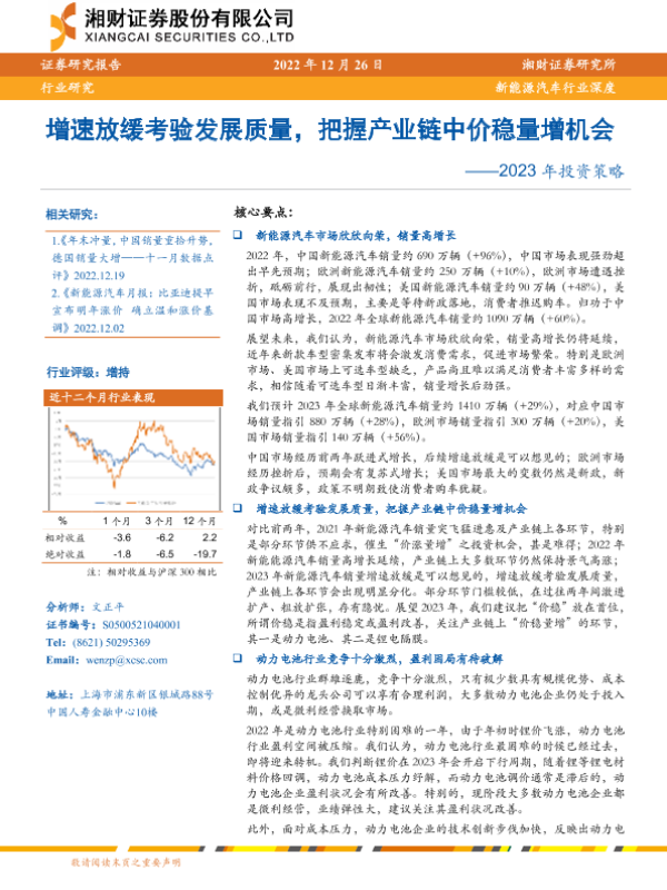 【湘财证券】【20221226】新能源汽车行业2023年投资策略:增速放缓考验发展质量,把握产业链中价稳量增机会-45页 行业研究