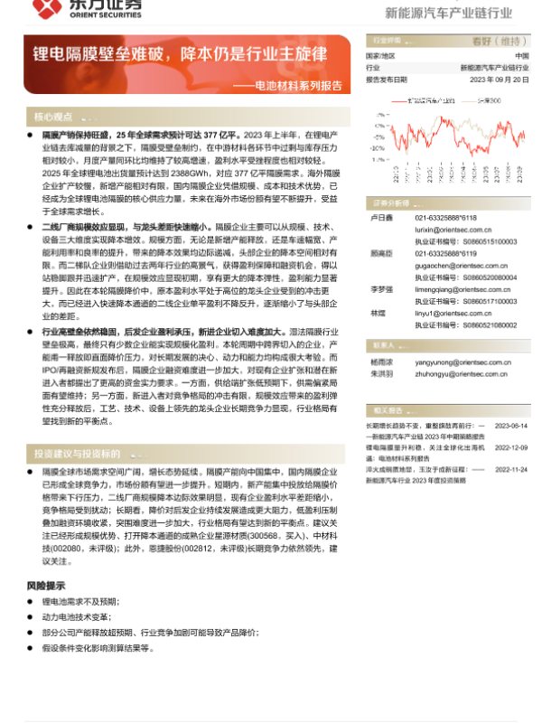 【东方证券】【20230920】电池材料系列报告:锂电隔膜壁垒难破,降本仍是行业主旋律-16页 行业研究