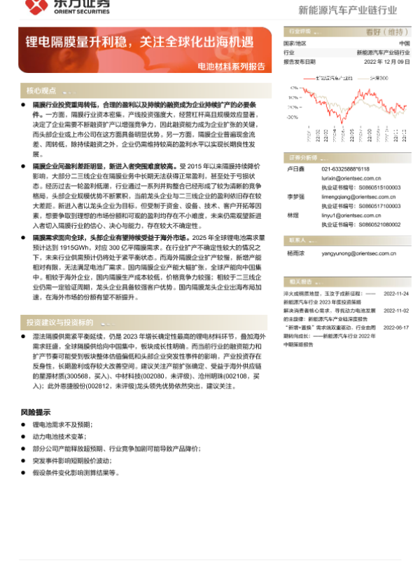 【东方证券】【20221209】电池材料系列报告:锂电隔膜量升利稳,关注全球化出海机遇-18页 行业研究
