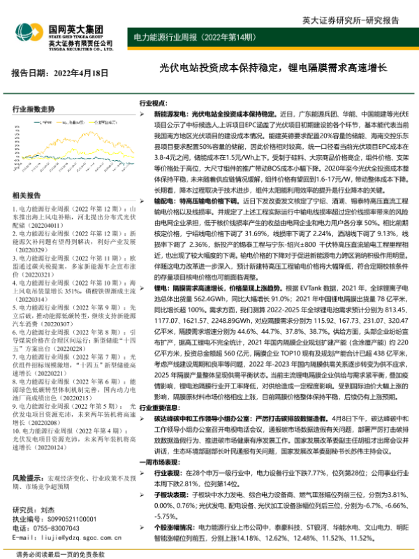 【英大证券】【20220418】电力能源行业周报(2022年第14期):光伏电站投资成本保持稳定,锂电隔膜需求高速增长-31页 行业研究