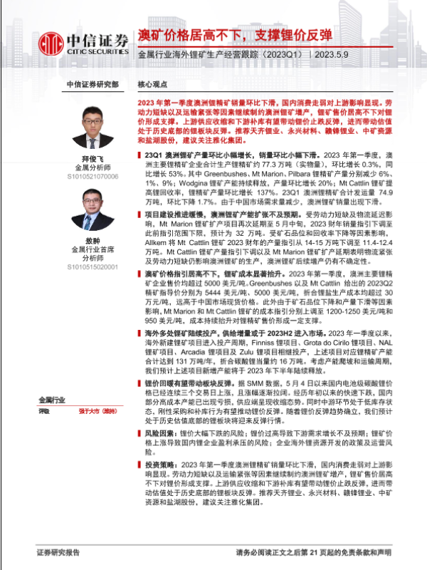 【中信证券】【20230509】金属行业海外锂矿生产经营跟踪(2023Q1):澳矿价格居高不下,支撑锂价反弹-22页 行业研究