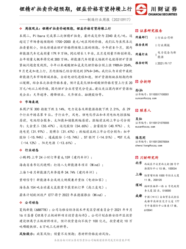 【川财证券】【20210917】制造行业周报:锂精矿拍卖价超预期,锂盐价格有望持续上行-13页 行业研究