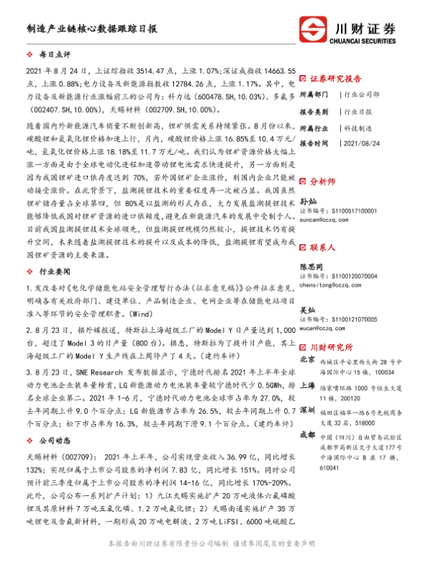 【川财证券】【20210824】制造产业链核心数据跟踪日报-5页 证券期货研究报告