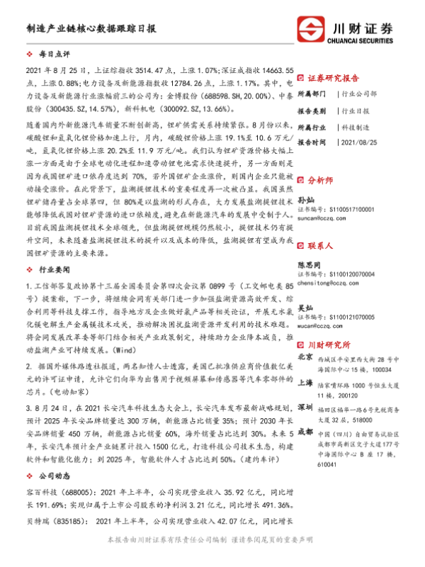 【川财证券】【20210825】制造产业链核心数据跟踪日报-5页 证券期货研究报告