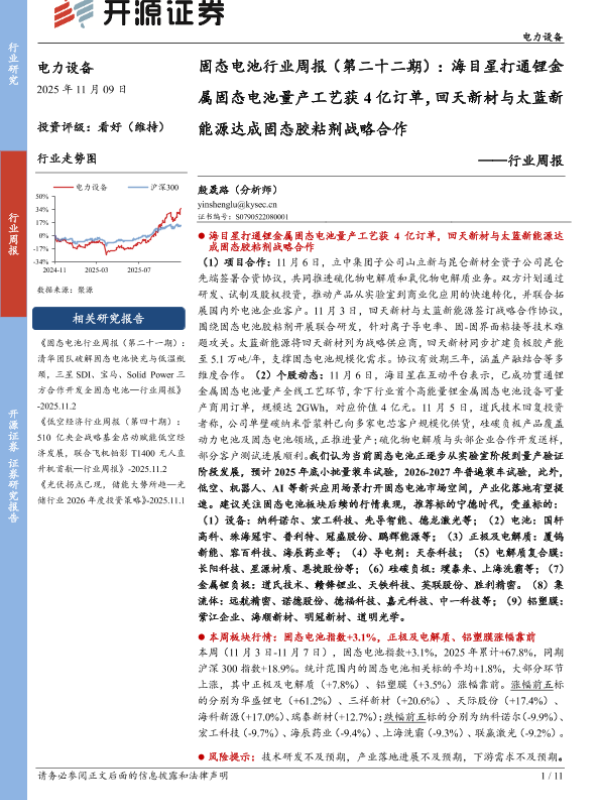 【开源证券】【202511】电力设备行业固态电池行业周报(第二十二期):海目星打通锂金属固态电池量产工艺获4亿订单,回天新材与太蓝新能源达成固态胶粘剂战略合作-11页 证券期货研究报告