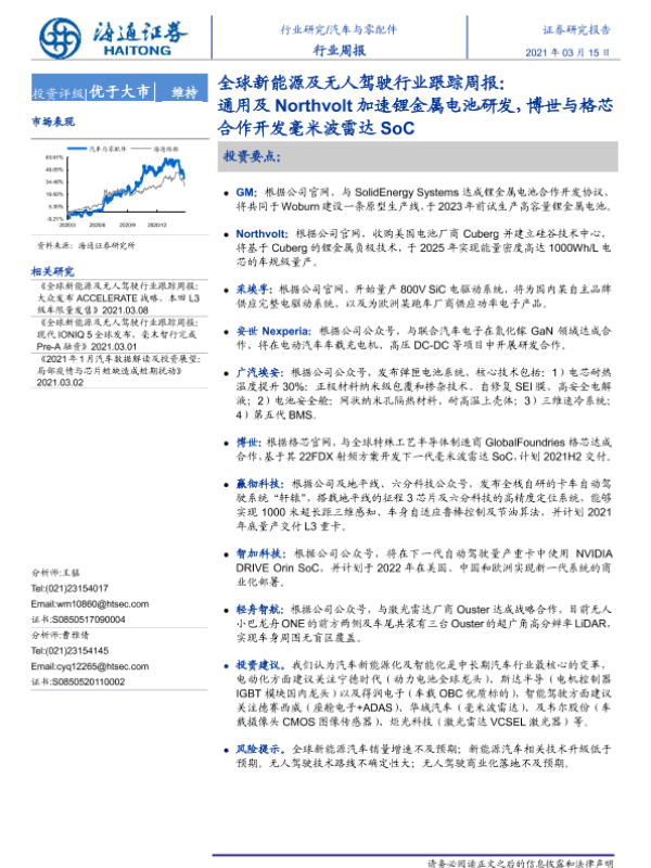 【海通证券】【20210315】全球新能源及无人驾驶行业跟踪周报:通用及Northvolt加速锂金属电池研发,博世与格芯合作开发毫米波雷达SoC-2页 行业研究