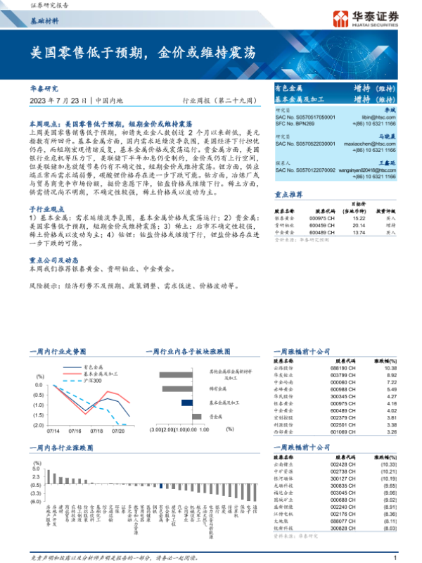 【华泰证券】【20230723】20230723-华泰证券-基础材料行业周报(第二十九周):美国零售低于预期,金价或维持震荡-15页 行业研究