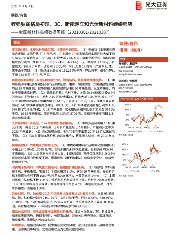 【光大证券】【20210307】金属新材料高频数据周报:锂强钴弱格局初现,3C、新能源车和光伏新材料继续强势-26页 行业研究