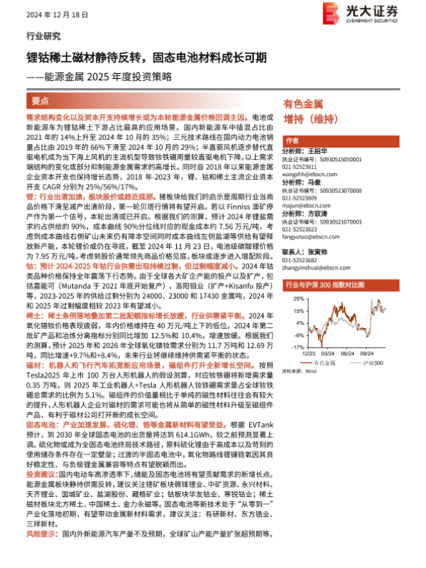 【光大证券】【20241218】能源金属行业2025年度投资策略:锂钴稀土磁材静待反转,固态电池材料成长可期-30页 行业研究