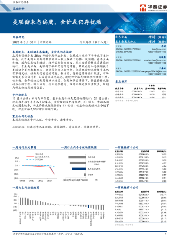 【华泰证券】【20230506】20230506-华泰证券-有色金属行业周报(第十八周):美联储表态偏鹰,金价或仍存扰动-18页 行业研究