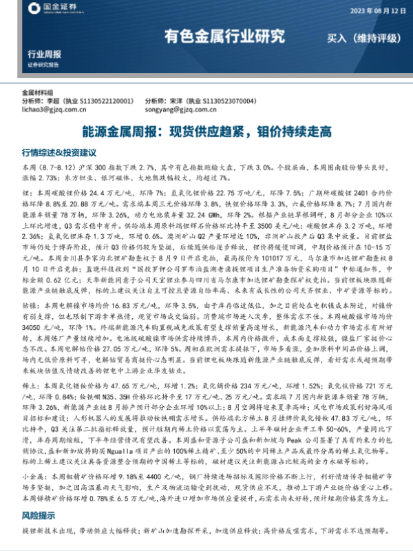 【国金证券】【20230812】20230812-国金证券-能源金属周报:现货供应趋紧,钼价持续走高-16页 行业研究