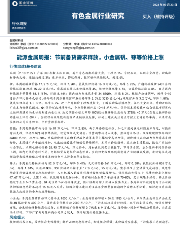 【国金证券】【20230922】20230922-国金证券-能源金属周报:节前备货需求释放,小金属钒、镓等价格上涨-16页 行业研究