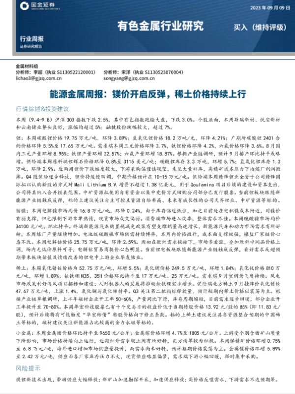 【国金证券】【20230909】20230909-国金证券-能源金属周报:镁价开启反弹,稀土价格持续上行-16页 行业研究