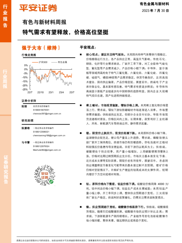 【平安证券】【20230730】20230730-平安证券-有色与新材料周报:特气需求有望释放,价格高位坚挺-16页 行业研究