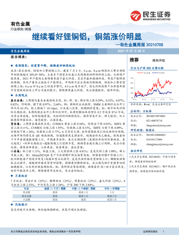 【民生证券】【20210705】20210705-民生证券-有色金属周报:继续看好锂铜铝,铜箔涨价明显-18页 行业研究