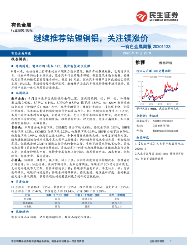 【民生证券】【20201123】20201123-民生证券-有色金属周报:继续推荐钴锂铜铝,关注镁涨价-18页 行业研究