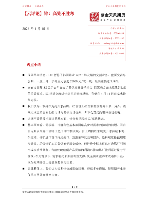【紫金天风期货】【202601】锌:高处不胜寒-9页 证券期货研究报告