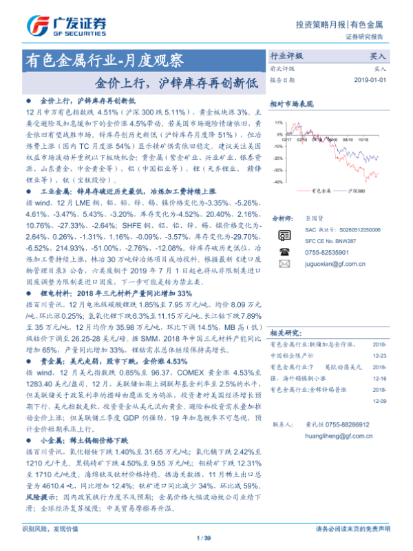 【广发证券】【20190101】20190101-广发证券-有色金属行业-月度观察:金价上行,沪锌库存再创新低-39页 行业研究