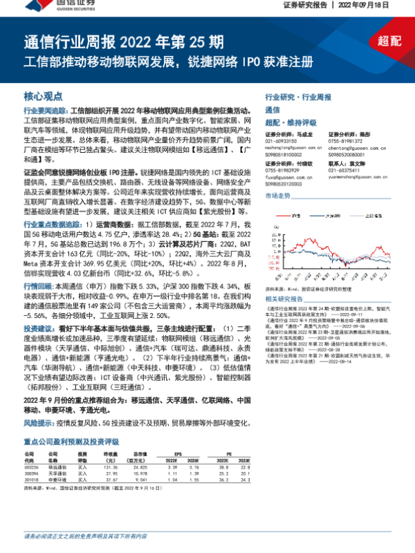 【国信证券】【20220918】通信行业周报2022年第25期:工信部推动移动物联网发展,锐捷网络IPO获准注册-29页 行业研究