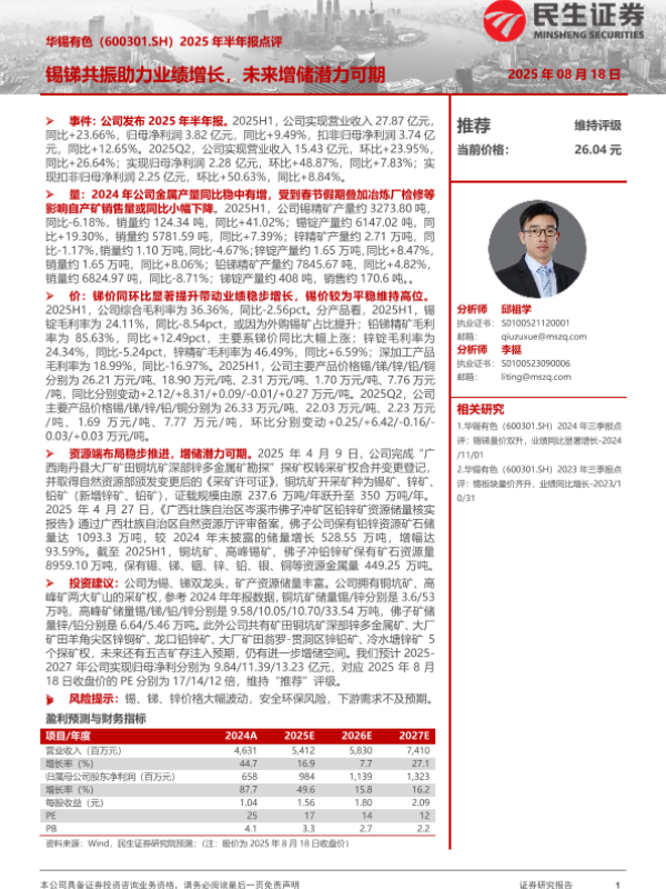 【民生证券】【202508】华锡有色(600301.SH)2025年半年报点评:锡锑共振助力业绩增长,未来增储潜力可期-21页 证券期货研究报告