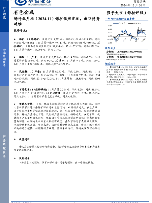 【华福证券】【20241230】锑行业月报(2024.11):锑矿供应充足,出口博弈延续-10页 行业研究