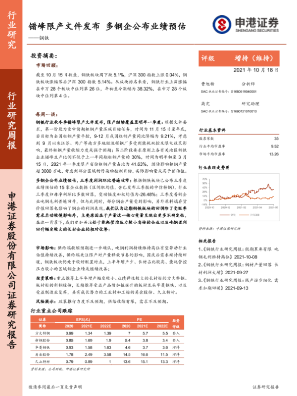 【申港证券】【20211018】钢铁行业研究周报:错峰限产文件发布 多钢企公布业绩预估-6页 行业研究