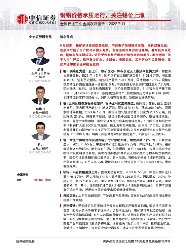 【中信证券】【20230711】金属行业工业金属跟踪报告:铜铝价格承压运行,关注锡价上涨-25页 行业研究