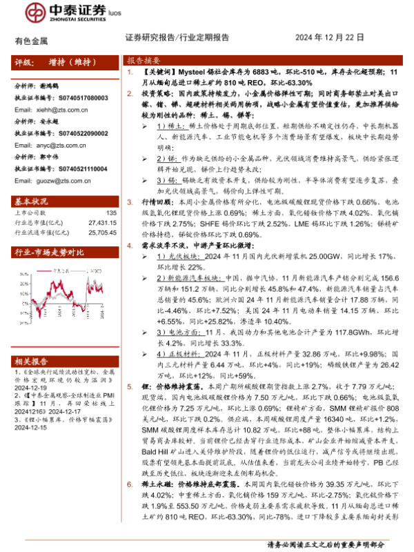 【中泰证券】【20241222】有色金属行业:锡库存去化超预期-25页 行业研究