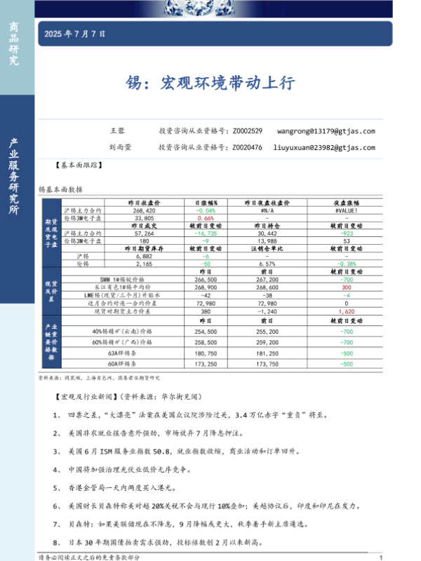 【国泰君安期货】【20250707】锡:宏观环境带动上行-3页 证券期货研究报告