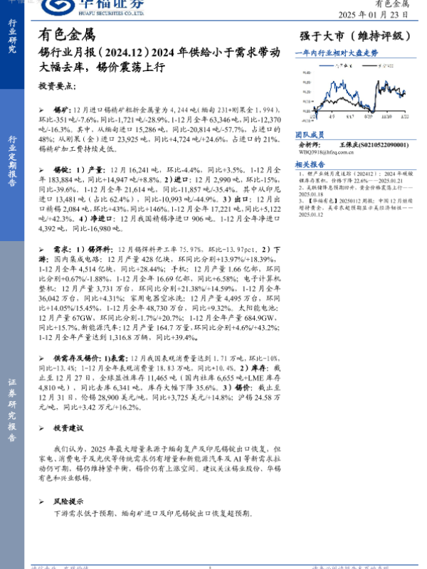 【华福证券】【20250123】20250123-华福证券-锡行业月报:2024年供给小于需求带动大幅去库,锡价震荡上行-11页 行业研究