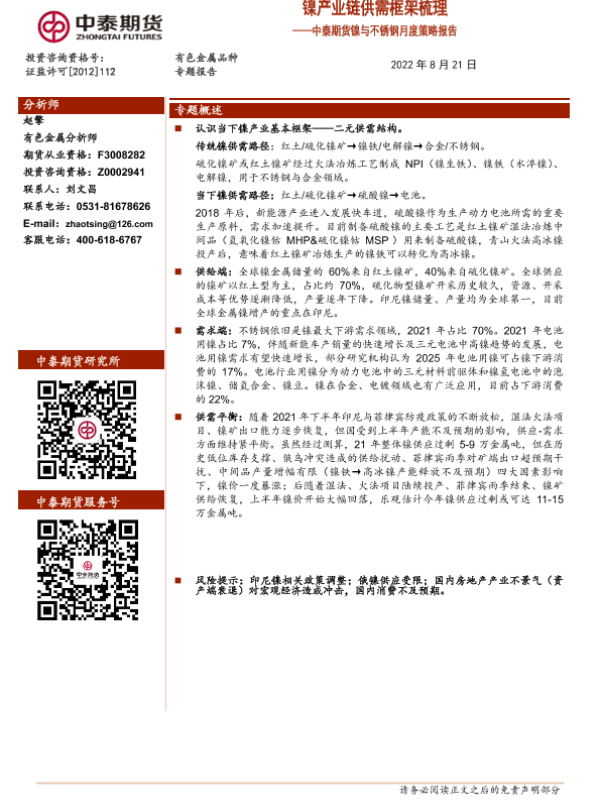 【中泰期货】【20220821】镍与不锈钢月度策略报告_镍产业链供需框架梳理-14页 行业研究