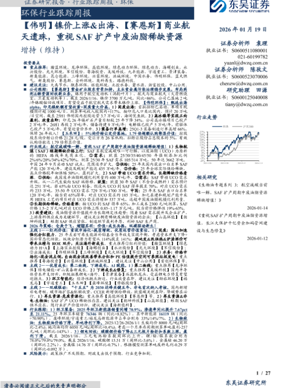 【东吴证券】【202601】2026-01-19_东吴证券_环保行业跟踪周报:【伟明】镍价上涨&出海、【赛恩斯】商业航天遗珠,重视SAF扩产中废油脂稀缺资源-27页 证券期货研究报告