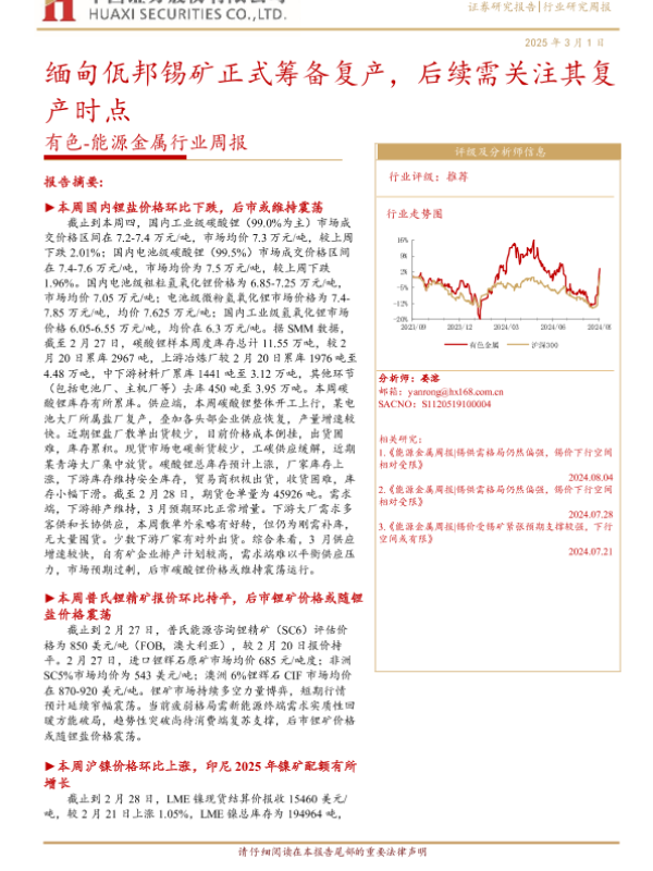 【华西证券】【20250301】20250301-华西证券-有色-能源金属行业周报:缅甸佤邦锡矿正式筹备复产,后续需关注其复产时点-29页 行业研究